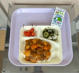 ハヤシライス、ミックス海そうのサラダ、さくらんぼ、ごはん、牛乳