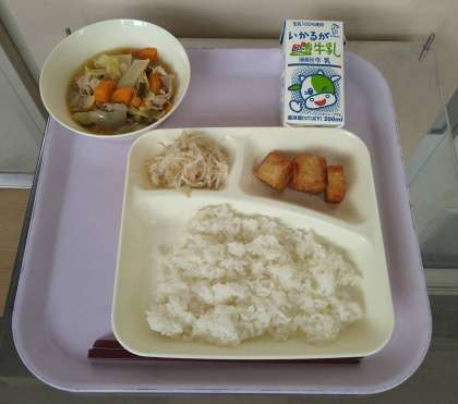 中華煮、あつあげのピリ辛じょうゆかけ、もやしの中華あえ、ごはん、牛乳