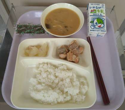 さけのつけ焼き、みそ汁、とうがんの煮もの、焼きのり、ごはん、牛乳