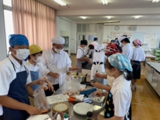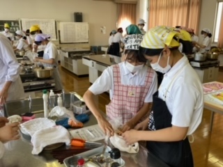 2組の調理実習の様子です。防災料理ということで、ビニール袋を使った炊飯や魚の調理を行いました。どの班も協力しながら楽しく美味しい食事を作っていました!