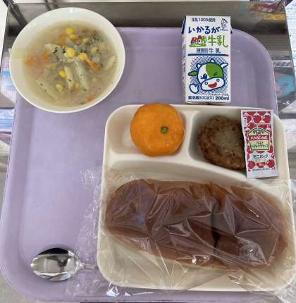 焼きハンバーグ、豆乳スープ、みかん(冷)、パン、牛乳