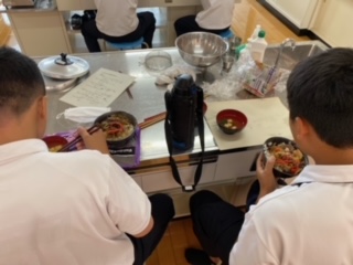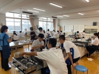 各クラス、順番に調理実習が行われています。今回は「牛丼」と「すまし汁」を作ります。食材を切ったり出汁をとったり、班のみんなと協力しながら出来ました。どの班もとっても美味しく仕上がりました!