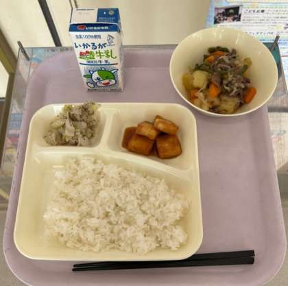 肉じゃが、あつあげのみそだれかけ、キャベツの赤じそあえ、ごはん、牛乳