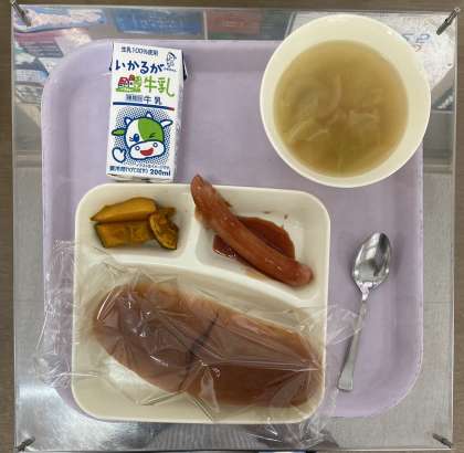 ウインナーのケチャップソース、スープ、焼きかぼちゃ、パン、牛乳