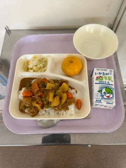 ポークカレーライス[米粉]、サワーソテー、みかん、ごはん、牛乳