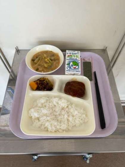 和風ハンバーグ、みそ汁、カボチャのいとこ煮、焼きのり、ごはん、牛乳