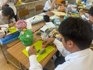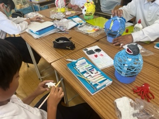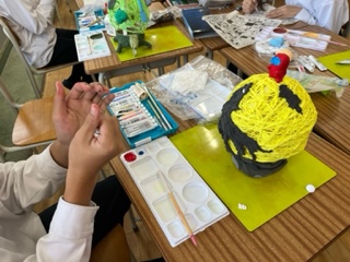 美術の時間には、明日展示する作品の仕上げに取りかかっていました。それぞれの個性が溢れる、素敵な作品ばかりです。
