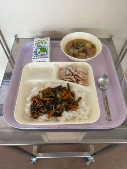 もずくと豚ひき肉のジューシー、さつまいものみそ汁、焼きれんこん、ごはん、牛乳