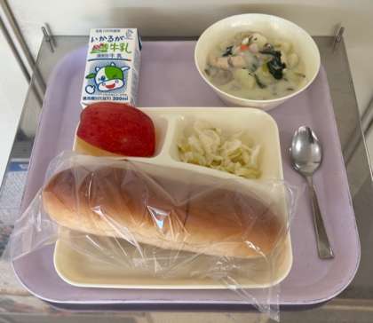 きのこのクリームシチュー、キャベツのピクルス、りんご、パン、牛乳