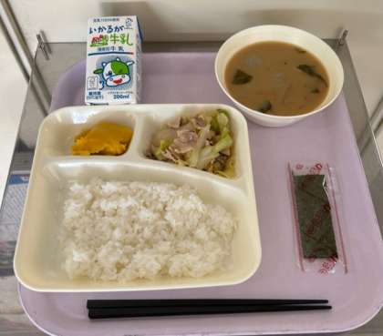 豚肉と野菜のいためもの、いわしのつみれ汁、かぼちゃういろう、焼きのり、ごはん、牛乳