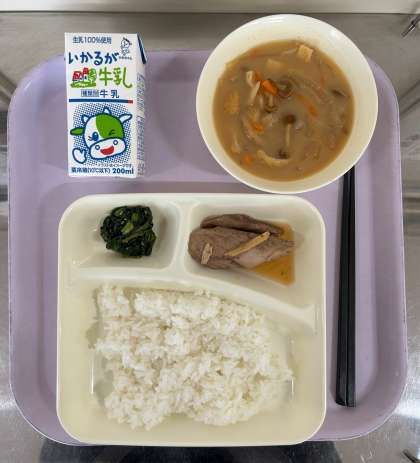 なまりぶしのしょうが煮、なめこのみそ汁、ほうれんそうのごまあえ、ごはん、牛乳