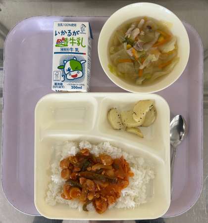 ケチャップライス、スープ、じゃがいものバジル焼き、ごはん、牛乳