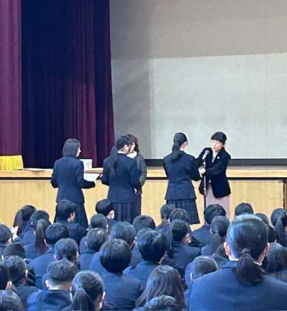 生徒会長からは、「2学期の3つの大きな行事、体育大会、文化発表会、桃中祭すべてを一致団結して成功できたことは素晴らしいことだと思います。そして、大きな目標を達成するための小さな目標に取り組むことを意識して、これからも頑張っていきましょう。」というお話がありました。