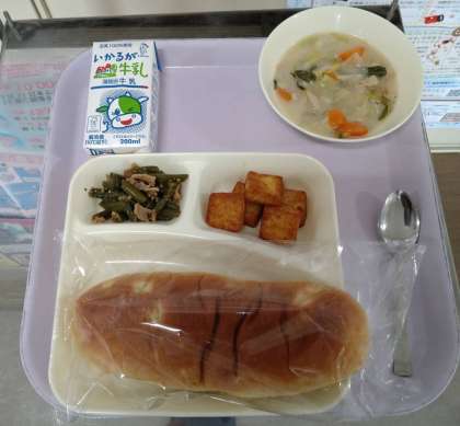 はくさいのクリーム煮、あつあげのピリ辛じょうゆかけ、豚肉とさんどまめのオイスターソースいため、パン、牛乳