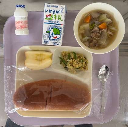 豚肉と野菜のスープ煮、カレーソテー、りんご、発酵乳、パン、牛乳