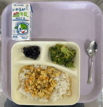 親子丼、ブロッコリーのごまあえ、黒豆の煮もの、ごはん、牛乳
