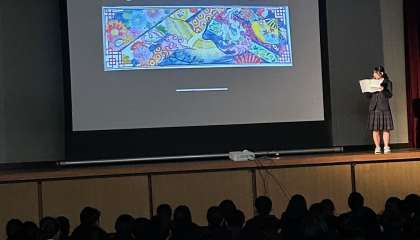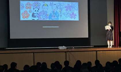 姉妹提携している甘泉外国語中学と桃谷中学校をつなぐ絆の旗を選ぶ総選挙がありました。全校生徒の中からノミネートされた14人の作品について、作者が投票前にプレゼンをしました。