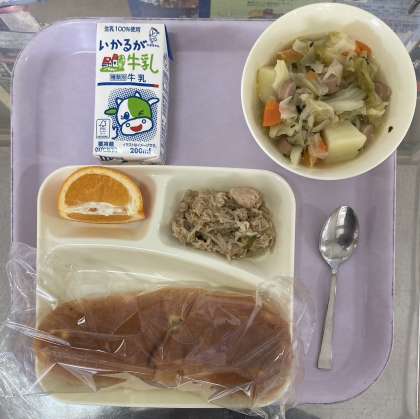 ポトフ、ツナと野菜のソテー、いよかん、パン、牛乳