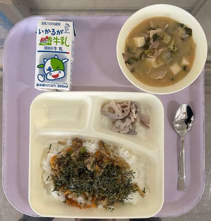 鶏ごぼうご飯、みそ汁、焼きれんこん、牛乳