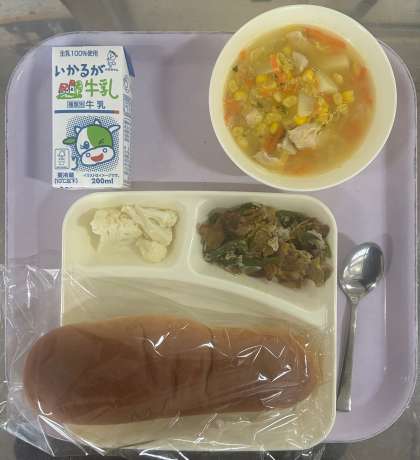 豚肉のカレー風味焼き、コーンとはくさいのスープ、カリフラワーのレモンドレッシング、パン、牛乳