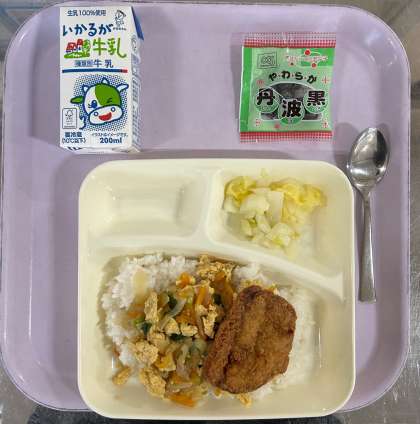 カツ丼、はくさいの甘酢あえ、ソフト黒豆、ごはん、牛乳