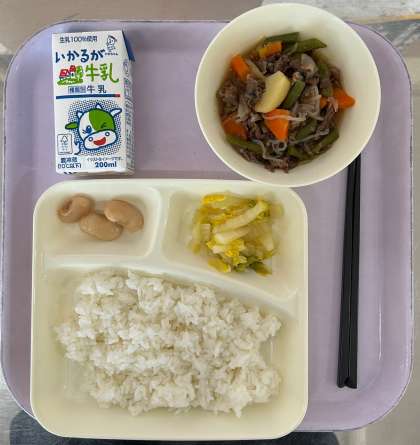 肉じゃが、はくさいのゆず風味、白花豆の煮もの、ごはん、牛乳