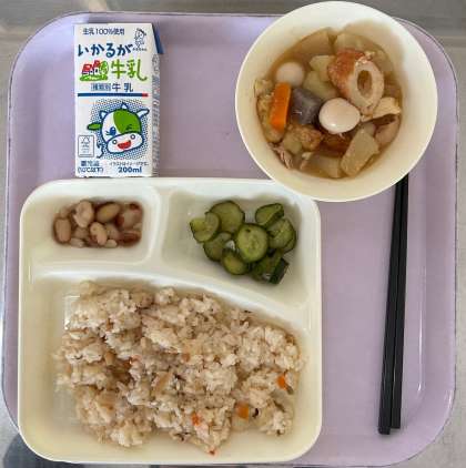 関東煮、きゅうりの梅風味、とら豆の煮もの、かやくご飯、牛乳