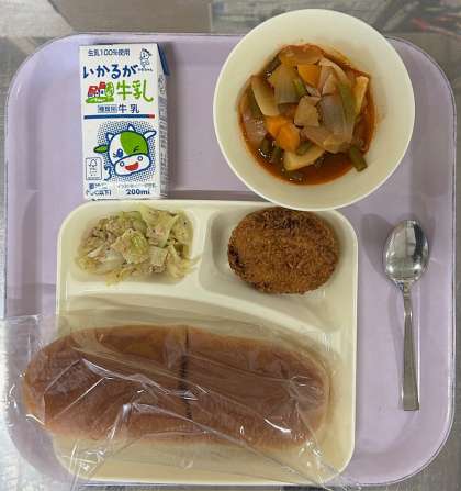 チキンレバーカツ、ケチャップ煮、ツナとキャベツのバジルソテー、パン、牛乳