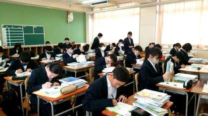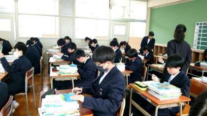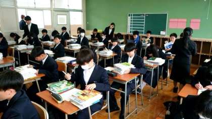 1年生の教室では各教科の教科書が配られました。算数が数学に、社会科も地理的分野や歴史的分野に分かれるなど、より専門的になりますね。皆さん、まずはお名前を記入中。春休みに少し予習をしてみましょう。