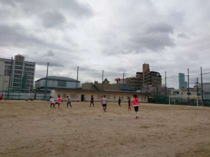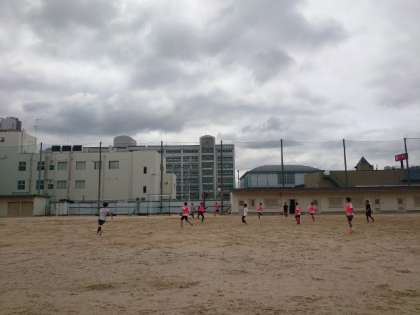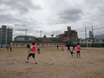 運動場ではサッカー部の皆さんが練習中。厚い雲が一面に広がるものの、運動に適したコンディション。皆さん、ボールを追って運動場を駆け回っています。休憩時間にはしっかりと給水を採ってくださいね。