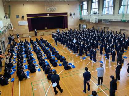 対面式です。1年の代表生徒と2,3年生の代表生徒からメッセージの交換をしました。今日から桃中生です。みんなで力を合わせて、何事にも一生懸命に取り組みましょう。