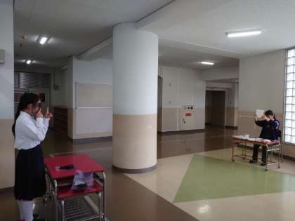 1年生の教室前では、視力検査が行われています。先生が「ランドルト環」のカードを示して、皆さんが輪の切れ目を答えます。もし視力に不安があれば、お医者さんに診ていただきましょう。