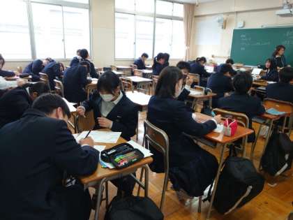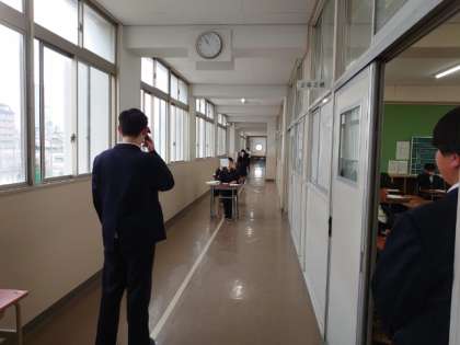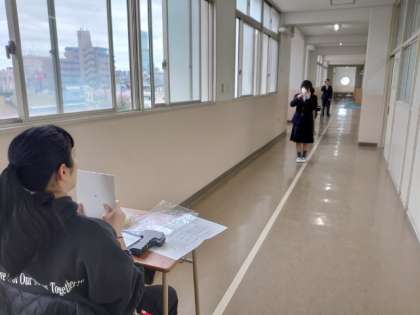 2年生の教室前では、視力検査の真っ最中。5m離れた位置から左右の視力を測ります。1年生の頃と比べて見え方はいかがですか?教室内は自己紹介カードを作っています。趣味や特技などのプロフィールをみんなに知ってもらいましょう。