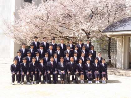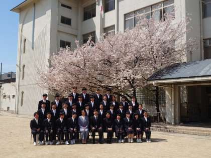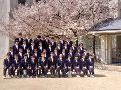 快晴の中、運動場で学級写真の撮影が行われました。少し大きめの学生服に身を包み、1年生の皆さんが撮影にのぞみます。ニッコリ笑顔で写していただきましょう。