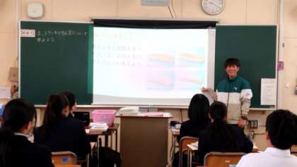 2年生理科の授業で「物質の変化」を学習します。今日は「ホットケーキがどうしてふくらむか」を考えます。ホットケーキの粉に含まれる「炭酸水素ナトリウム」が水や牛乳などに反応して発生する炭酸ガスが、熱を加えることで大きくふくらむそうです。美味しいホットケーキにも化学の作用が関係しているのですね。