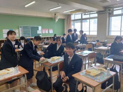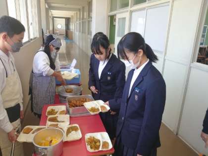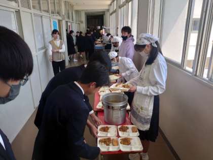 お昼休みのチャイムが鳴り、お待ちかねの給食の時間。1年生の皆さんが協力して配食の準備をしています。今日は「カツカレーライス・フルーツゼリー」の入学お祝いメニューだそうです。カレーの良い香りが教室まで届いています。1年生の皆さん、美味しくいただいてくださいね。