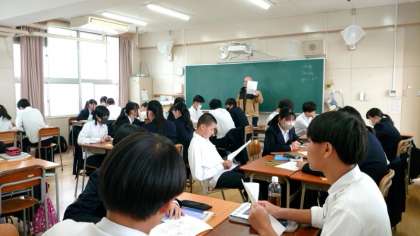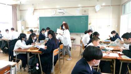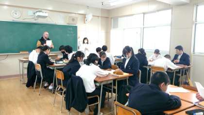 3年生英語科の授業では、C-NETのホワイト先生がグループ学習を行っています。イラストに描かれた2名の人物がどのような会話をしているかを英語で考えるとのこと。皆さん、どんなストーリーにするか相談しながら、英会話を完成させましょう。