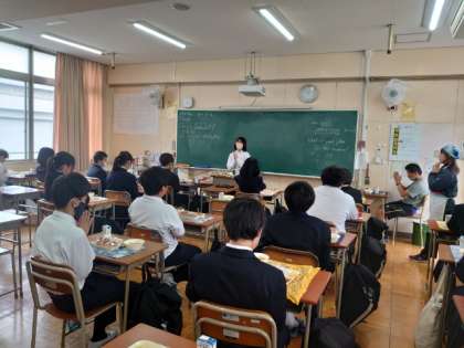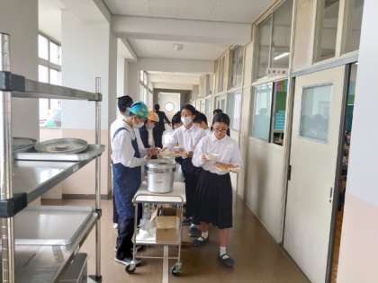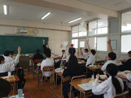 午前の授業が終わり、2年生の教室前で給食の準備が行われています。今日は「煮込みハンバーグ・野菜スープ・洋ナシ」の洋風献立。たまねぎやマッシュルームと一緒に煮込まれたハンバーグは人気のおかず。追加のハンバーグにたくさんの手があがります。みんなでじゃんけんしていただきましょう。