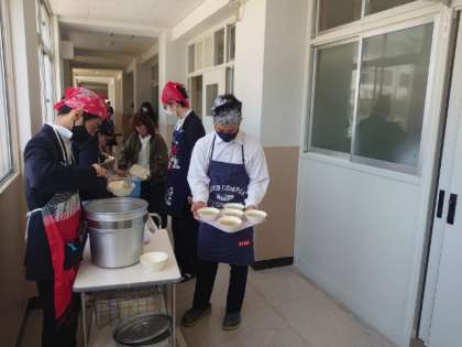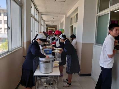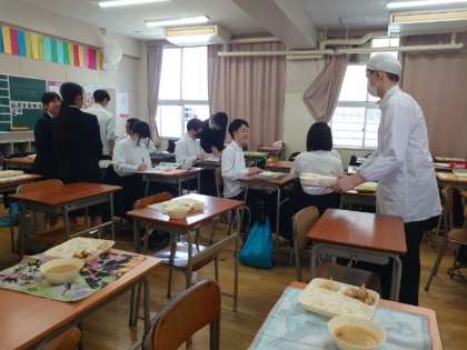 お昼休みのチャイムが鳴り、3年生の皆さんが協力して給食の配食中。今日は「焼き鳥・モヤシの柚子の香和え・お味噌汁」の和食メニュー。玉ねぎやキャベツ、ニンジンがたっぷり入ったお味噌汁は、たくさんのお野菜が摂れそうです。皆さん、美味しくいただきましょう。