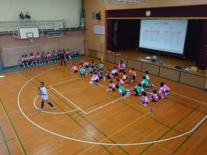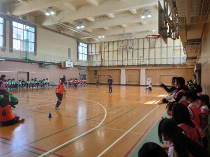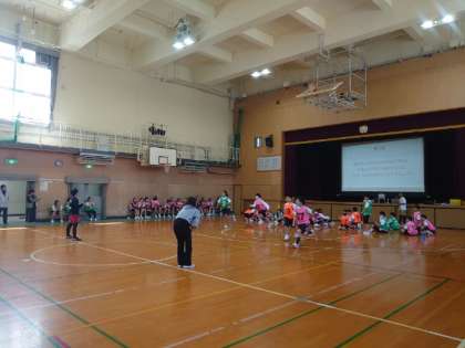 各競技種目にクラスの仲間が出場します。クイズを出題し、正解するとゴールをめざせるゲームもあるようです。体育館の両サイドから仲間を応援する声援が響きます。みんなで楽しむ週末の午後のひととき。1年生の団結力がしっかりと育まれています。