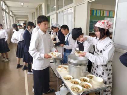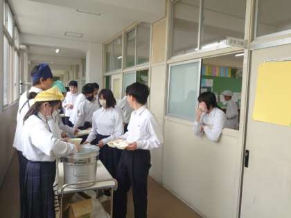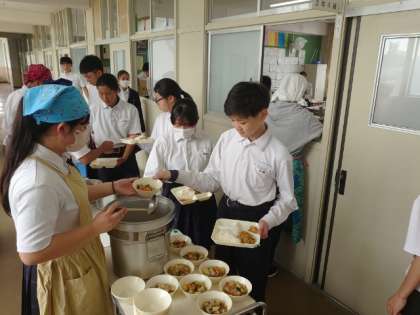 午前の授業が終わり、お待ちかねの給食の時間。2年生の教室前では配食が進んでいます。今日は「鶏とじゃが芋の煮物・厚揚げの醤油掛け・紅サケのそぼろ」の和風献立。サケのそぼろを白ご飯にかけていただきます。皆さん、午後の授業・活動にむけてパワーをチャージしてくださいね。