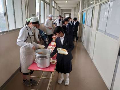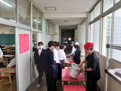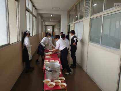 お昼休みになり、1年生の教室前で給食の用意が行われています。今日は「ビーフシチュー・三度豆とコーンのサラダ・甘夏柑」の洋風献立。根菜類と牛肉をコトコト煮込んだビーフシチューはパンにピッタリですね。お腹と相談して、お代わりしてくださいね。