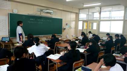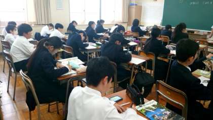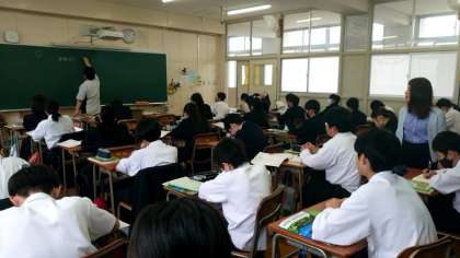 1年生英語科で助動詞の「can(〜できる)」を使った英文を教わります。動詞(原形)の前に can をつけると「〜することができる」という表現になります。皆さん、「I can speak English.」と言えるように頑張りましょう!