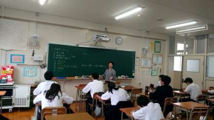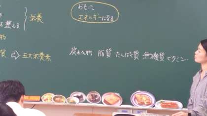 2年生家庭科の授業で「栄養素」について考えます。私たちは、日々の食事を通して、いろいろな栄養素を摂取しています。エネルギーになるものや体の調子を整えるものなど、健康に過ごすために栄養素の役割は大切ですね。黒板には美味しそうなお料理の写真が並んでいます。どのお料理にどんな栄養素が含まれるか、考えてみましょう。