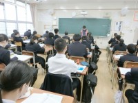 2年生英語の授業で新しく習う単語や熟語を教わります。スクリーンにこれから習う単語や熟語が次々に映し出されます。「apologize(謝る)」や「 next door(お隣)」など、英語の発音が流され、みんなが後に続きます。アクセントの位置に着目して、1語づつ覚えてくださいね。