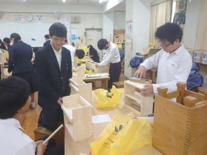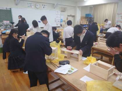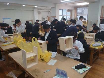 技術科の授業で2年生の皆さんが製作している木製ラック。現在、仕上げの工程に入っている模様。カンナやヤスリを使ってラックの表面を滑らかに仕上げる人や、木工ボンドを利用して補強する人など、最終の仕上げに取り組んでいます。お気に入りの作品になると良いですね。