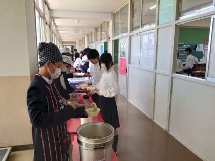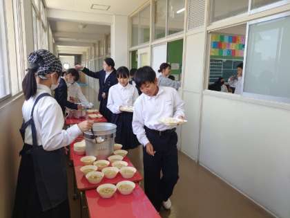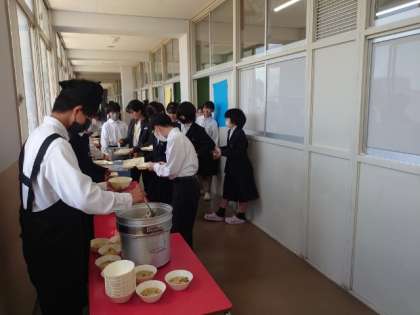 お昼休みになり、1年生の皆さんが給食準備に取り組んでいます。今日のメニューは「鮭のゴマ味噌焼き・エンドウ豆の卵とじ・五目汁」。鮭のゴマ味噌焼きは、甘辛い味付けでご飯がすすみそう。しっかりとエネルギーチャージして、午後からの授業も頑張ってくださいね。