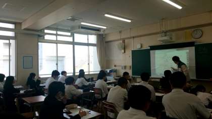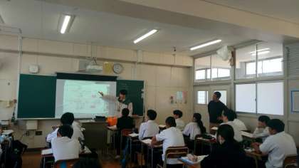 2年生数学の授業で「文字式の計算」を学習中。今日は「文字式の割り算」を教わります。スクリーンに問題が映され、先生が解き方を1つづつ説明します。説明を聞いたら、実際に問題を解いてみます。いろんな問題を数多く解き進め、計算方法を身に付けましょう。