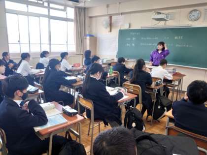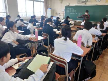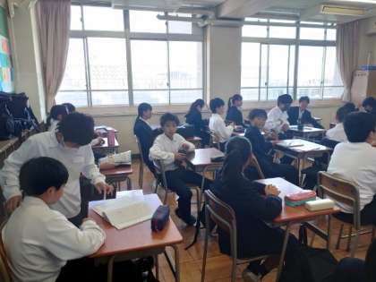 テスト開始前の1年生教室では、先生が本日の予定やテスト後の提出物などの連絡を行っています。皆さんの机上には、教科書やワークが広げられ、学習内容の最終チェックに余念がありません。今、確認している問題が出題されると良いですね。