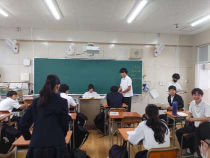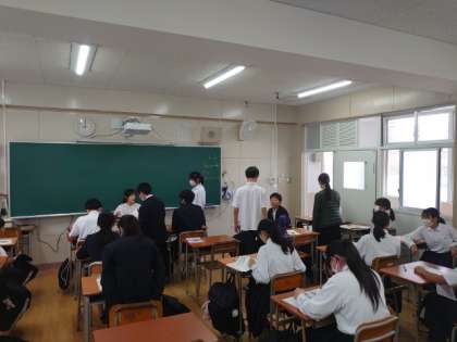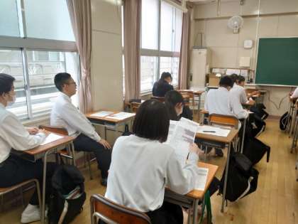 3年生の教室では英語のテストを返却中。皆さんお互いに結果を見せ合いながら、楽しくおしゃべりしています。和やかな雰囲気が良いですね。この後は、先生の解説をしっかり聞いて、今後の学習に役立てましょう。